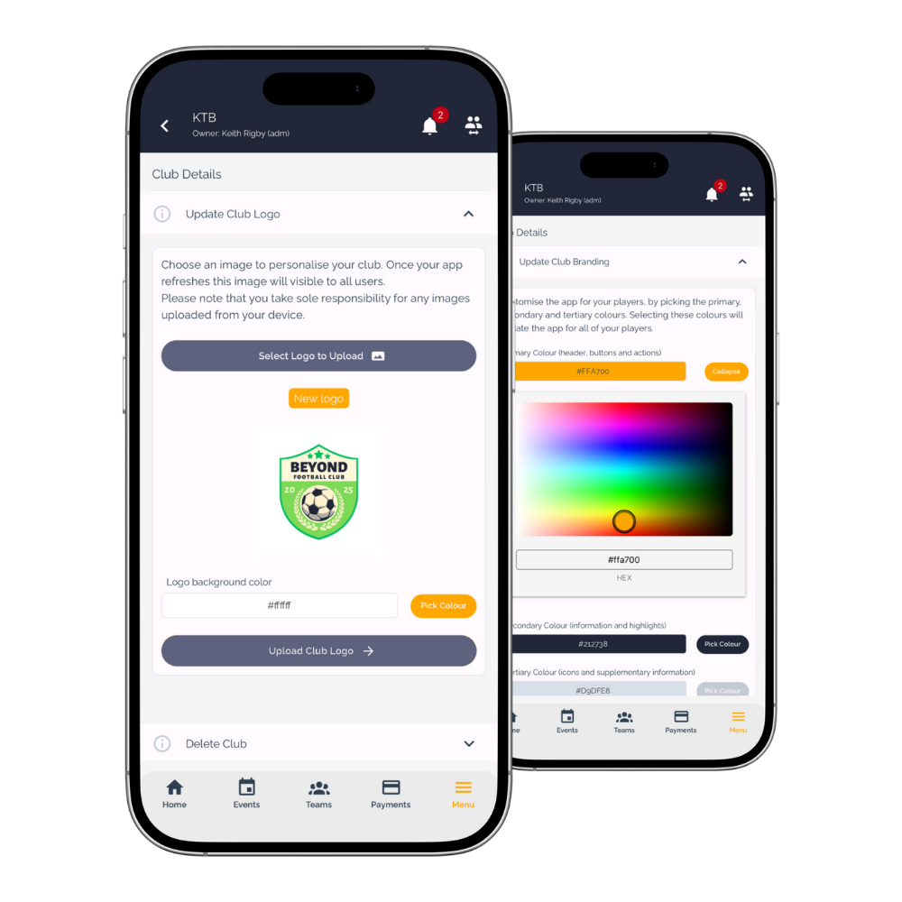 Upload your club badge and see how it is automatically applied throughout the App in many different ways, including background images, logo's and match day cards.