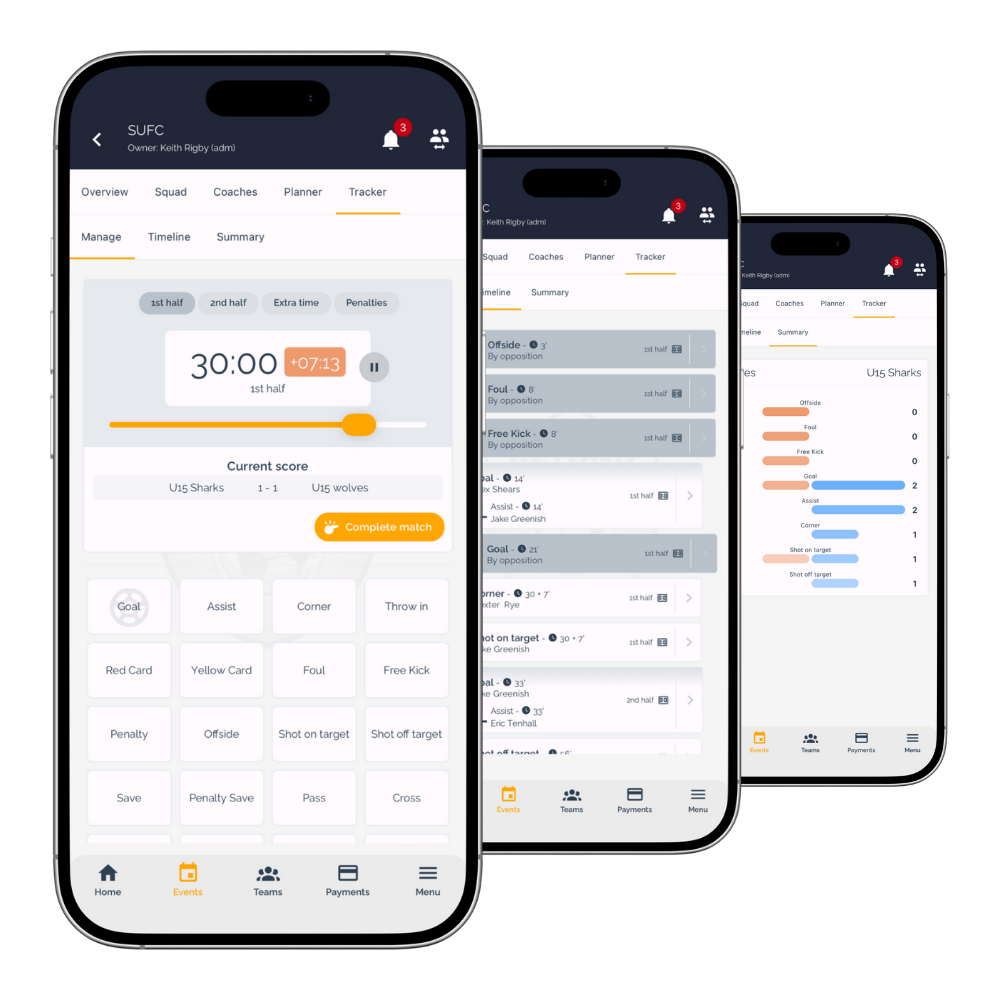 Build upon game-time analysis, starting line-ups and available squad with 'game tracker' to plan changes in personnel and formations in advance. Track and record match stats in real-time to share with members. Produce match analysis summary reports from stats to aid learning.